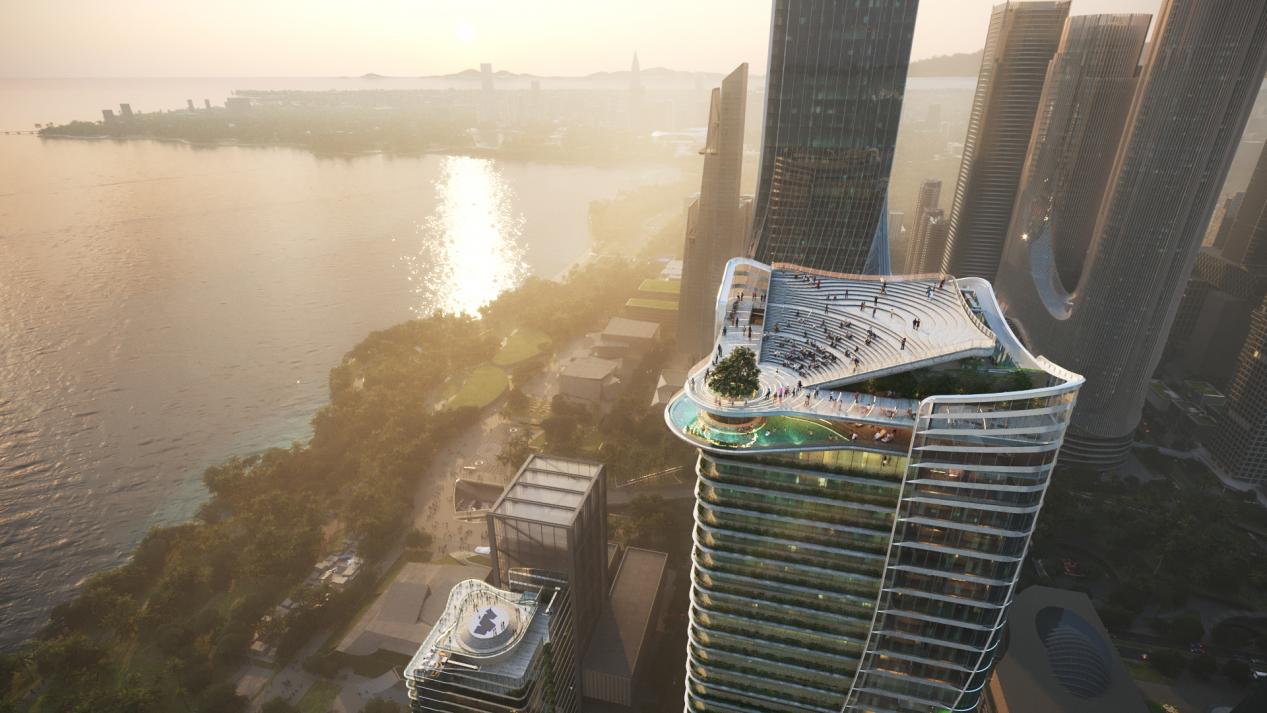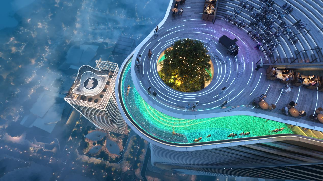 尤为值得一提的是,项目极度注重生态绿色与公共共享。通过打造“呼吸式”的办公环境,将清新空气与自然光线引入建筑每个角落;融入下沉庭院、骑楼界面等岭南特色元素,营造出兼具传统韵味与现代舒适的宜人空间。同时,创新打造“第六立面——融合屋顶公共空间,云端剧场、无边泳池与“生命之树”艺术装置。